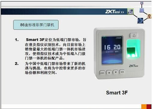 Smart 3F定位為中端門禁市場(chǎng),旨在普及指紋識(shí)別技術(shù),向目前市場(chǎng)上銷售量最大的低端門禁一體機(jī)市場(chǎng)進(jìn)攻,使得指紋技術(shù)成為中端入門級(jí)門禁一體機(jī)的標(biāo)配產(chǎn)品。為中國(guó)中低端門禁市場(chǎng)帶來(lái)了新的機(jī)遇與挑戰(zhàn),也將為中控帶來(lái)更多的市場(chǎng)份額和利潤(rùn)空間。
