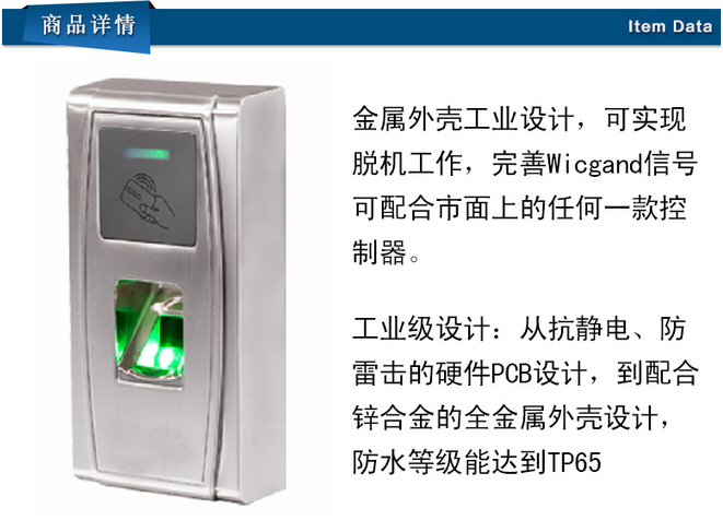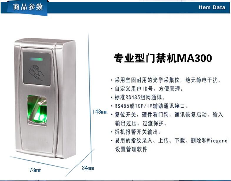MA300射頻卡指紋門禁多功能一體機是基于ZEM700平臺開發(fā)的射頻卡指紋門禁新款產(chǎn)品。全金屬外殼工業(yè)設(shè)計,可實現(xiàn)脫機工作,完善Wiegand信號,可配合市面上的任何一款控制器。帶Wiegand In功能,可支持主從機。超穩(wěn)定的多臺機器網(wǎng)絡(luò)連接是MA300的一大特點,是安防工程項目中的首選精品,適合于銀行、部隊、監(jiān)獄等高安全需求單位