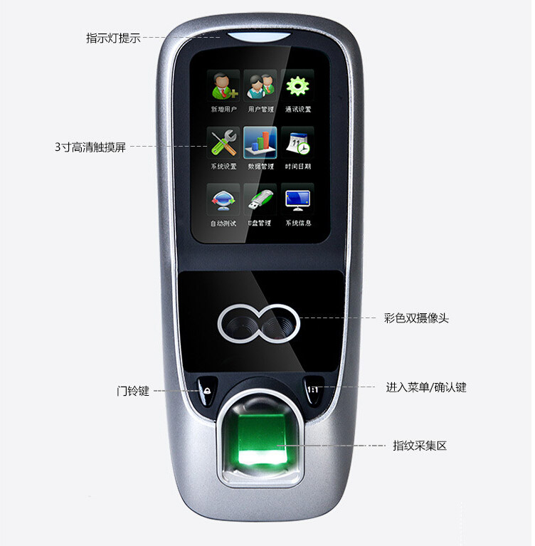 IFACE7是基于ZEM800多媒體開發(fā)平臺(tái)設(shè)計(jì)開發(fā)的一款面部、指紋、RFID混合驗(yàn)證門禁終端。采用ZKFinger10.0指紋面部混合識(shí)別算法,容量大,識(shí)別速度快,同時(shí)采用了嵌入式Multi-Bio CPU,主頻為630MHZ,可以處理高達(dá)1:20000的1:N速度,支持面部/面部+指紋/面部+卡/面部+指紋+卡等多種混合驗(yàn)證方式,極大提高了使用的安全性;集成高分辨率夜視紅外和彩色雙攝像頭功能,適用范圍廣,不受外界光線的影響,無論是在強(qiáng)光下還是在黑暗中也能進(jìn)行有效識(shí)別。支持高級(jí)門禁功能(不同時(shí)間段開門,多人開門,拆機(jī)報(bào)警,門未關(guān)好報(bào)警,門被非法打開報(bào)警,開門按鈕輸入,有線門鈴接口,一路警報(bào)輸出,脅迫報(bào)警等),擁有完善的Wiegand信號(hào),可配合市面上的任何一款控制器。標(biāo)配的TCP/IP通訊,支持跨網(wǎng)段跨網(wǎng)關(guān)連接,是安防工程項(xiàng)目的首選精品,適合與銀行、部隊(duì)、機(jī)房等高安全需要單位。